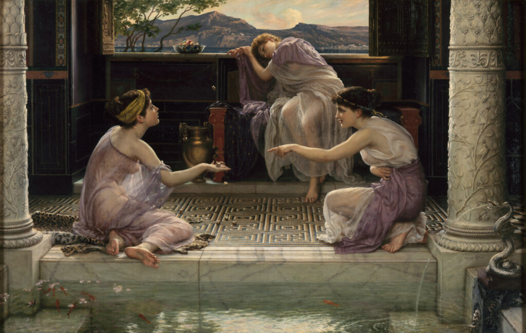 19世紀のヨーロッパで、保守的なアカデミーの画家たちは古代ギリシャを美の規範としました。その一人イギリスのエドワード・ジョン・ポインターは聖書や神話を題材に人気を博しましたが、この絵は古代ローマ風の室内で、二人の女性がお手玉に似たゲームをする姿は、ギリシャで発掘された素焼きの小像や壺絵に基づいています。窓辺で眠る女性は夏のけだるさの象徴といわれます。透ける衣装や滑らかな肌、石の模様などの描写には高い技量が示されています。