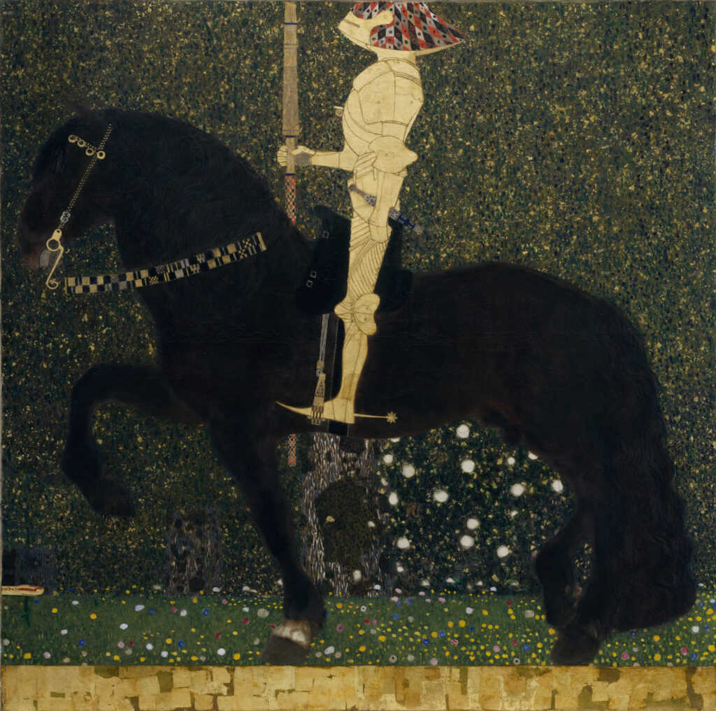 黄金色の甲冑(かっちゅう)に身を固め、右手で槍(やり)を持ち、黒鹿毛の馬にまたがる騎士。騎士も馬も平面的に描かれ、兜(かぶと)や槍の柄、手綱(たづな)などには工芸的な装飾が用いられています。19世紀末のウィーンで、写実的な作風からの大きな変化を試みて非難を浴びたグスタフ・クリムトは、我が道を貫く自分の決意をこの騎士の姿に重ねて表現しました。騎士は前方の蛇や足元の幹に潜むどくろ顔の魔物には目もくれず、背景の森に金をまき地面に色とりどりの花を咲かせながら、悠然と進んでいきます。