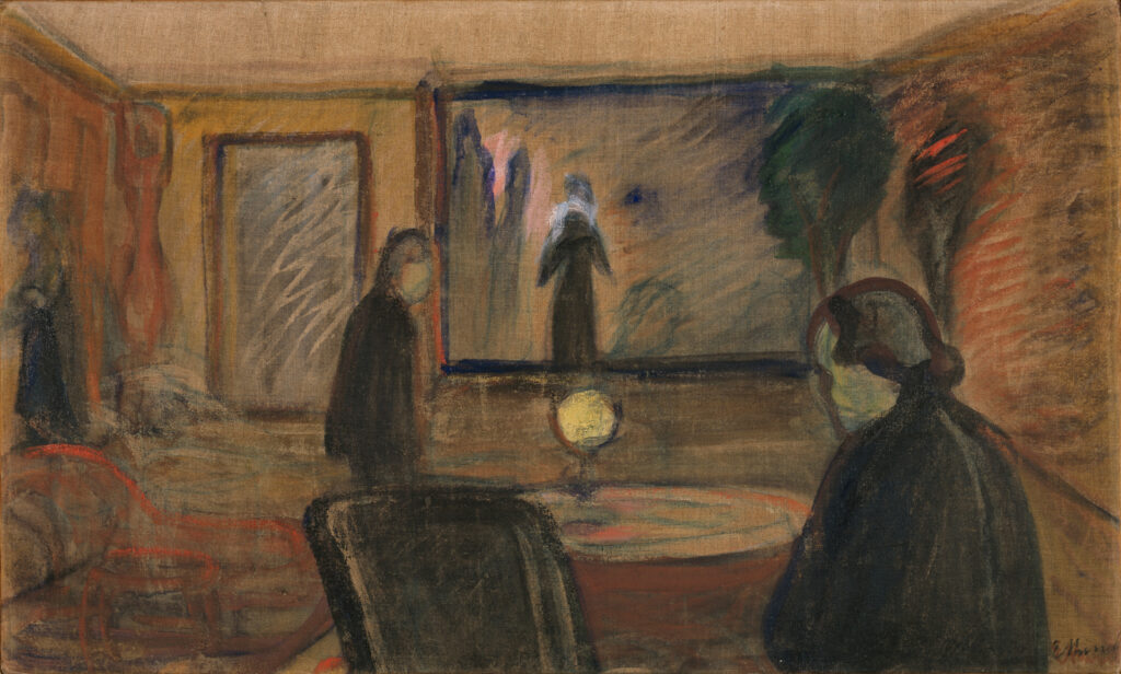 《叫び》で知られるエドヴァルド・ムンクがベルリンの劇場から依頼され、彼と同じノルウェーの劇作家ヘンリック・イプセンの『幽霊』上演の舞台イメージとして描いた連作の一点です。10年前に他界した地方名士の秘密が露わとなり家族が一夜にして破滅に向かう筋書きで、陰鬱なフィヨルドに面したガラス窓や、無情に時を刻む大時計のある部屋の中、無言の人々が別々の方角を向いて思いに沈んでいます。暗色の衣装、テーブルのランプに照らされた黄緑色の顔が不安を高め、制作最後に加えられた赤色が血の因縁を暗示しています。