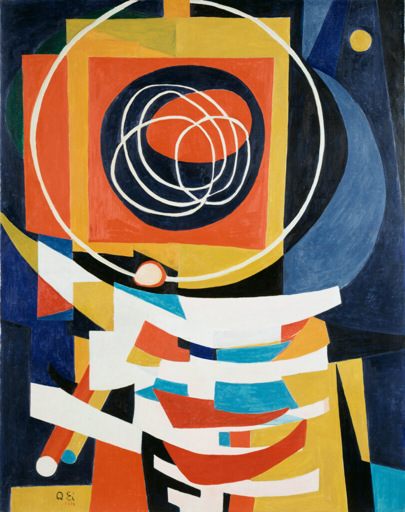 瑛九(えいきゅう)は印画紙に電灯光を当てて描く方法を「フォト・デッサン」と名付け、25歳の1936年に作品集を刊行。その後、水墨画や印象派風・点描など変遷を経て、1940年代後半から抽象絵画を追究しました。この作品には、切り抜いた型紙を印画紙の上で動かしながら複数回露光するタイプのフォト・デッサンに通じる感覚があります。画面上半で正方形の中にある輪ゴムのような形が回転するうちに外側の大きな真円になり、右の青い背景へと傾いて行きます。下半部では白・赤・青の断片が振り子状に左右に揺れながら降りていくかのようです。