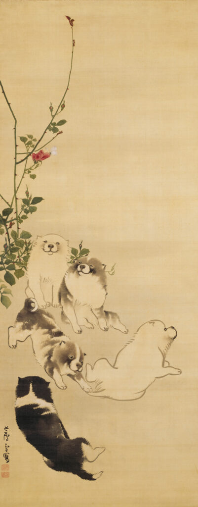 伊藤若冲(いとうじゃくちゅう)・曽我蕭白(そがしょうはく)と並び「奇想の画家」とされる長沢芦雪(ながさわろせつ)は、師の円山応挙(まるやまおうきょ)が得意とした子犬の絵をさらに人間っぽく描きました。本図では5匹の子犬のうち2匹が赤いバラの花を見上げていて、バラの美しさがわかるのかと思いきや、花にとまる蝶がいます。彼らの手前には右外の何かに気を取られている白犬がいて、興奮して動くしっぽを隣の茶白犬が叩いていますが、そのしっぽもくるりと巻いています。左下で後ろ姿の黒犬は芦雪の子犬図の常連で、芦雪の分身ではと考えられています。
