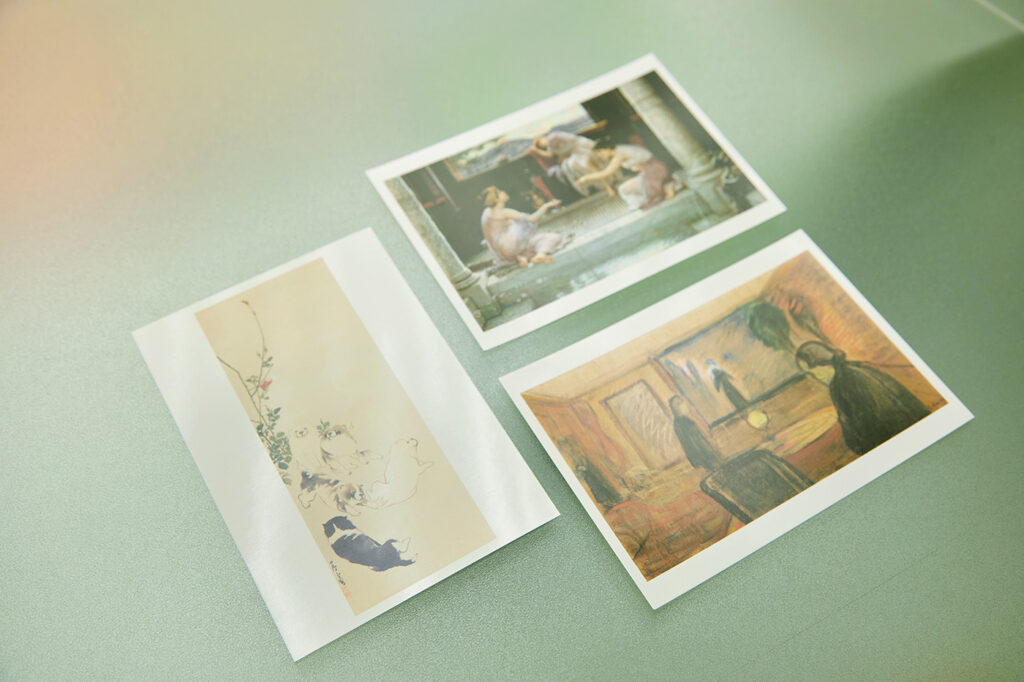 ポストカード 芦雪《薔薇蝶狗子図》、ポインター《世界の若かりし頃》、ムンク《イプセン『幽霊』からの一場面》など
