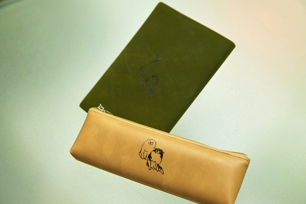 長沢芦雪《薔薇蝶狗子図》(ばらちょうくしず)に出てくるふわふわの犬たちの愛らしいデザインに、犬好きな人は一目惚れすること間違いなし。文庫サイズのブックカバー(1,210円)は、深みのある緑色が心落ち着く読書の時間に寄り添います。ペンケース(1,100円)はベージュとグレーの2色展開で、メガネケースとしても使えるサイズ感です。