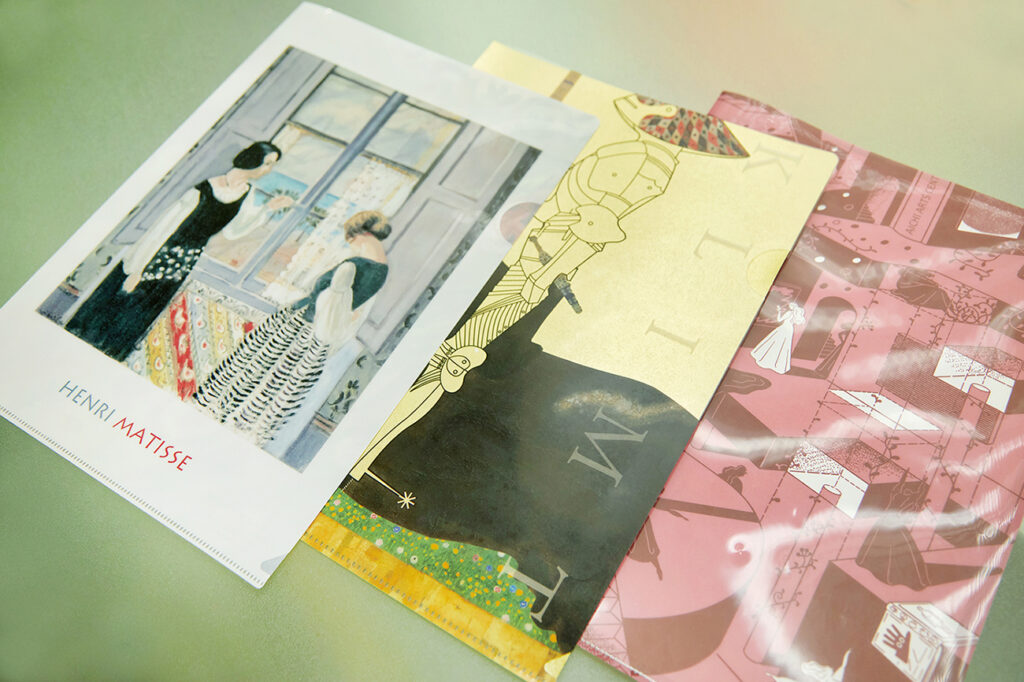 何枚あってもうれしいクリアファイル。写真左より、アンリ・マティス《待つ》(385円)はフランス・ニースのアパルトマンの一室で描かれた作品をデザインし、表面も裏面も素敵。グスタフ・クリムト《人生は戦いなり(黄金の騎士)》(550円)、愛知県出身アーティストの鷲尾友公×AAC(440円)の絵柄から、好みや気分に合わせて選んでください。