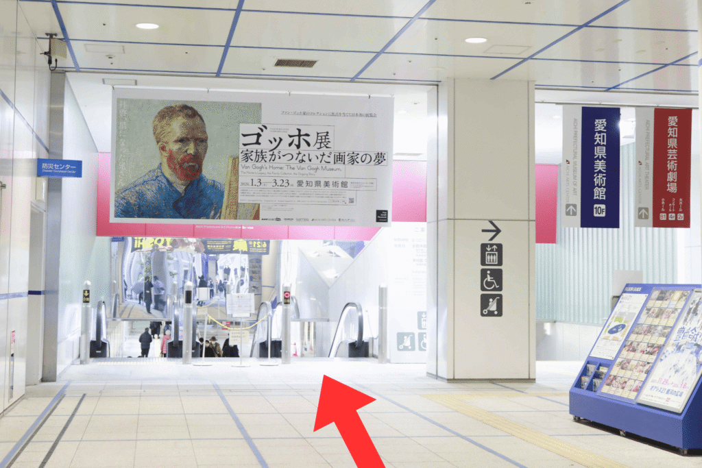 地下連絡通路は、雨の日でも濡れずに快適です。オアシス21からまっすぐ進んだ先に見えるのが、愛知芸術文化センターの入口です。エレベーターで10階へ。