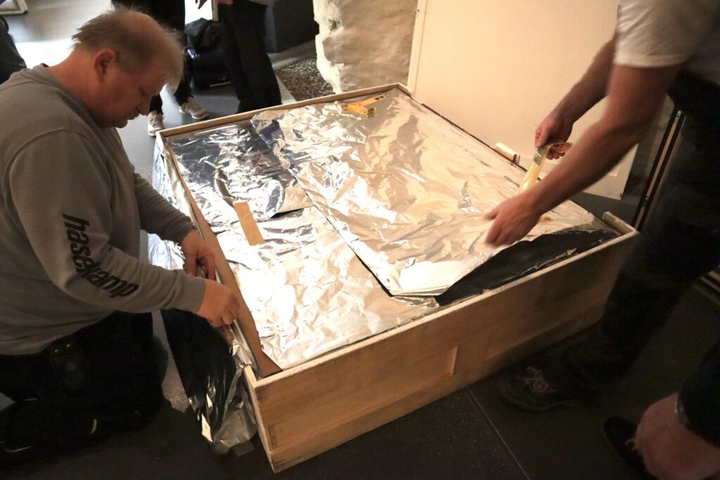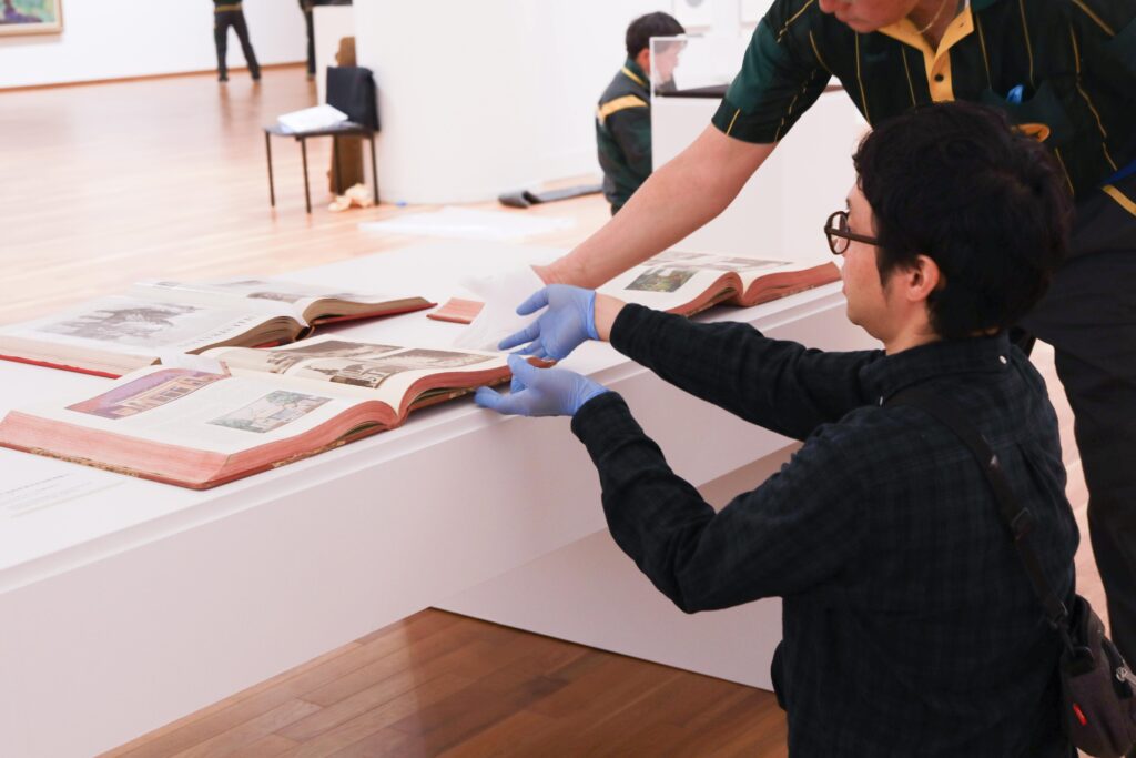 海外の美術館へ無事に作品を届けたら、現地のスタッフと一緒に梱包を開封して状態などを確認します。