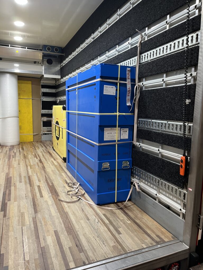 輸送中に、作品に負担がかからないように、進行方向に合わせた向きや隣に置く荷物のことなどを細かく指定するのも仕事。