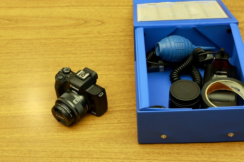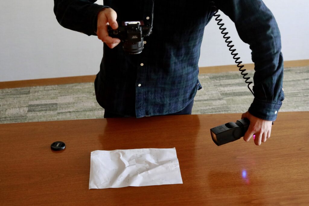 作品の状態を点検するときは、軽くてコンパクトなカメラを使用。凹凸を記録するため、斜めからフラッシュを当てて撮影することもあります。