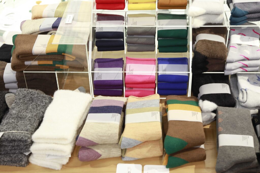 愛知県江南市を拠点にオリジナル靴下を制作する「靴下のhacu」(江南市大間町)の季節の新作がずらり。左右非対称(柄違い)のカラーリングが印象的な「ふゆごもり」シリーズは、総パイル×裏起毛の贅沢な仕立てと履き口にゴムがない「no gomu」仕様が心地よく、初の2サイズ展開なので、親子やカップルでお揃いが楽しめます。「hacuと尾州 ロングウォーマーグローブ」は、寒い日のおでかけや通勤時にも大活躍。