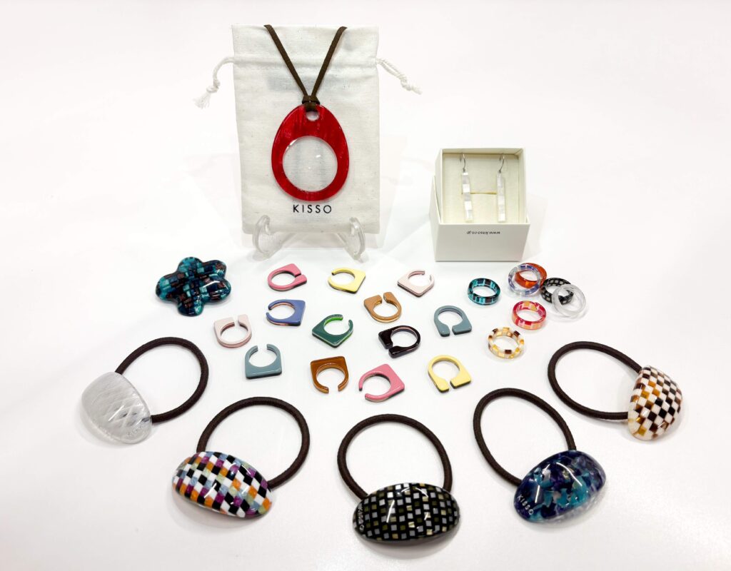 「KISSO」(福井県鯖江市)は、眼鏡のまちで生まれた「世界にひとつ」が見つかるアクセサリーブランド。眼鏡の素材であるセルロースアセテートという、コットンを主原料としたバイオマス素材を用い、熟練の職人が手作業で柄を組み上げることで、独特の表情をもつ素材を作ります。それらを何層にも貼り合わせ、削り、丁寧に一つひとつ磨き上げたアクセサリーは、まるで天然石のような美しさ。同じ色・柄が二つとない一点ものです。天然由来の素材のためアレルギーが少なく、着け心地も軽いので、肌にやさしく馴染みます。イヤーカフやリング、ブローチなど幅広く揃い、自分用にはもちろん、母の日や年配の方への贈り物としても選ばれています。