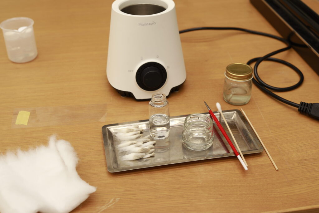 作品に付着した汚れを、綿棒と筆で丁寧にクリーニング。補修用接着剤の膠(にかわ)は、使う前に湯煎で溶く必要があるので、哺乳瓶ウォーマーを使っています。