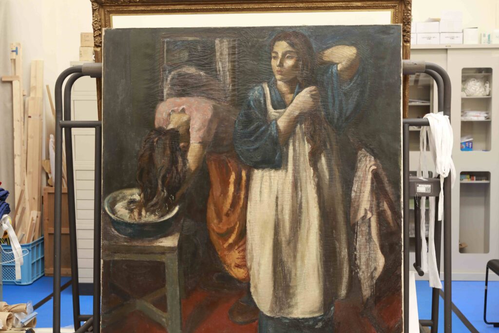 取材時に修復室にあった作品は、松下春雄《髪を洗ふ女》(1930年)。古くなったキャンバスの補強や破れの修復のため、「裏打ち」の作業などが行われました。