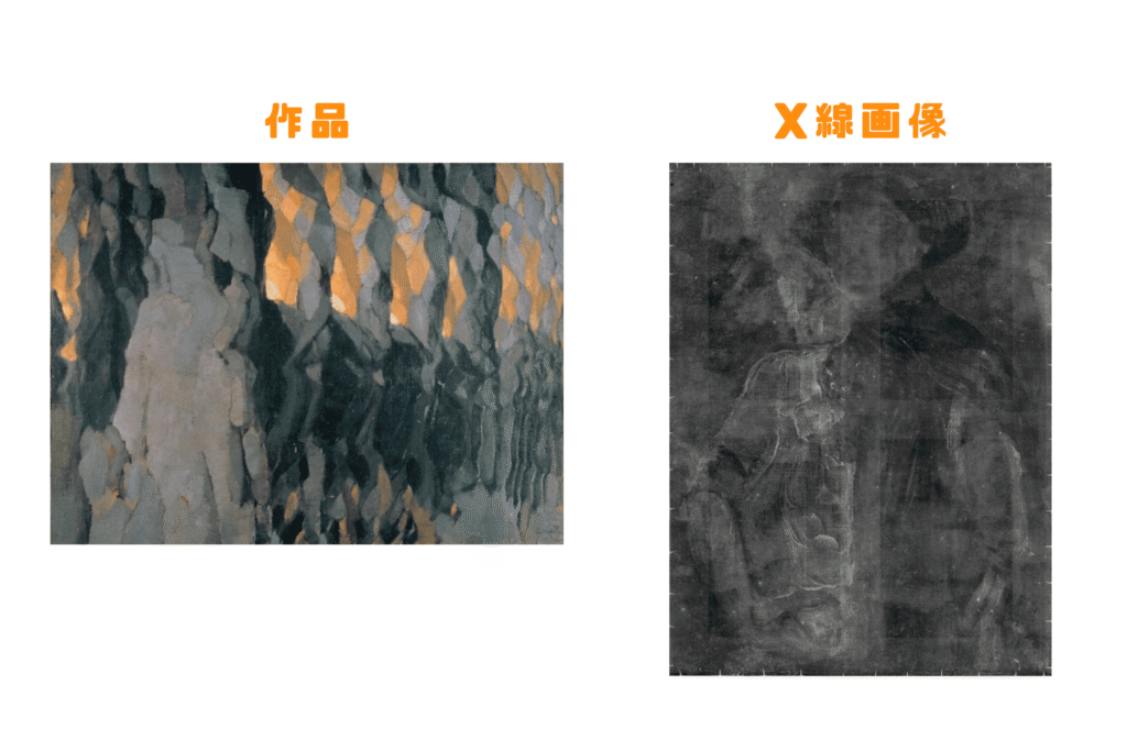 フランティシェク・クプカ《灰色と黄金の展開》(1920-21年)のX線画像(左に90度回転)の下層に、女性像と思われる別の絵が描かれていることがわかります。