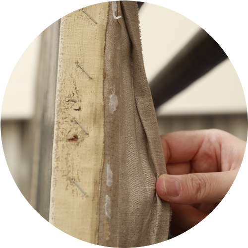 取材時に修復室にあった作品は、松下春雄《髪を洗ふ女》(1930年)。古くなったキャンバスの補強や破れの修復のため、「裏打ち」の作業などが行われました。