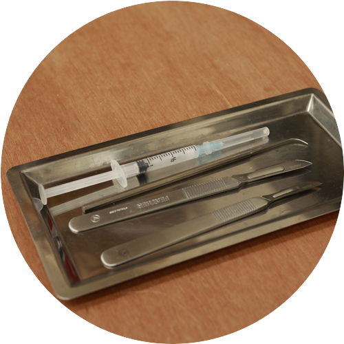 有機溶剤を使うこともあるので、排気ダクトを備えています。病院や理科室、図工室で見かけるような注射器やピンセット、顕微鏡などの器具もありますね。