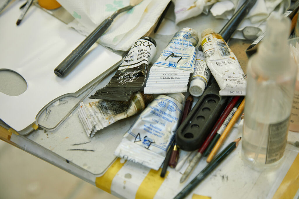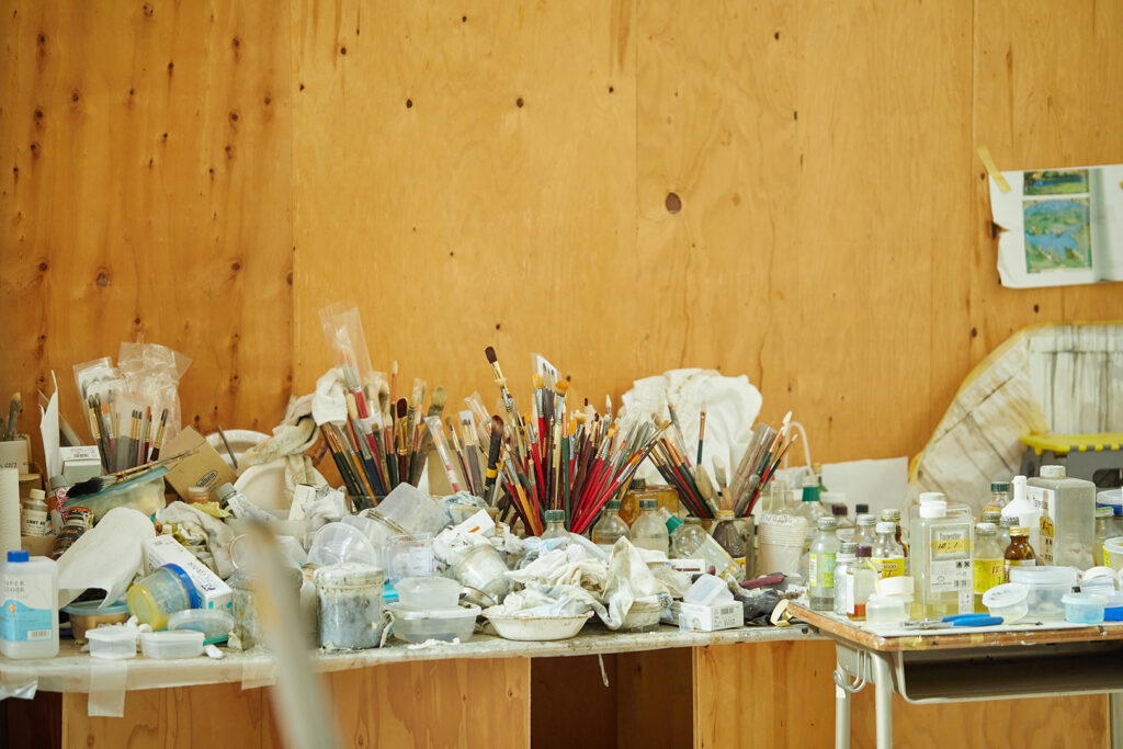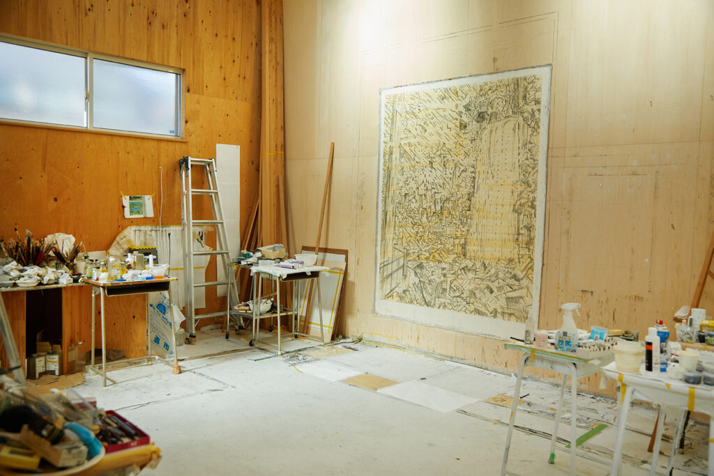 取材は、8年前に建設された愛知県内のアトリエにて。天井高を生かした開放感があり、高窓から自然光がたっぷり入る心地良い空間で、「自宅にも近く、制作を日課として集中できるようになった」と𠮷本。明里夫人と愛知県美術館美術課長の深山も加わり、𠮷本の博識で軽妙な芸術トークが弾んだ。