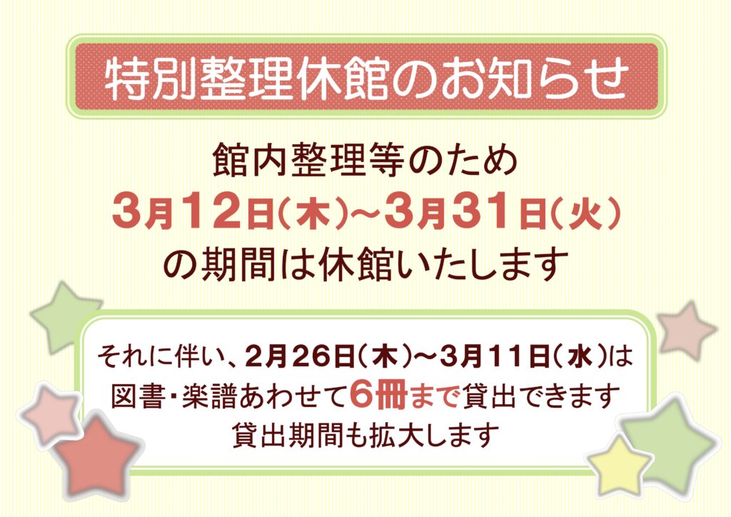 アートライブラリーは、館内図書整理等のため、2026年3月12日(木)〜31日(火)まで休館します。