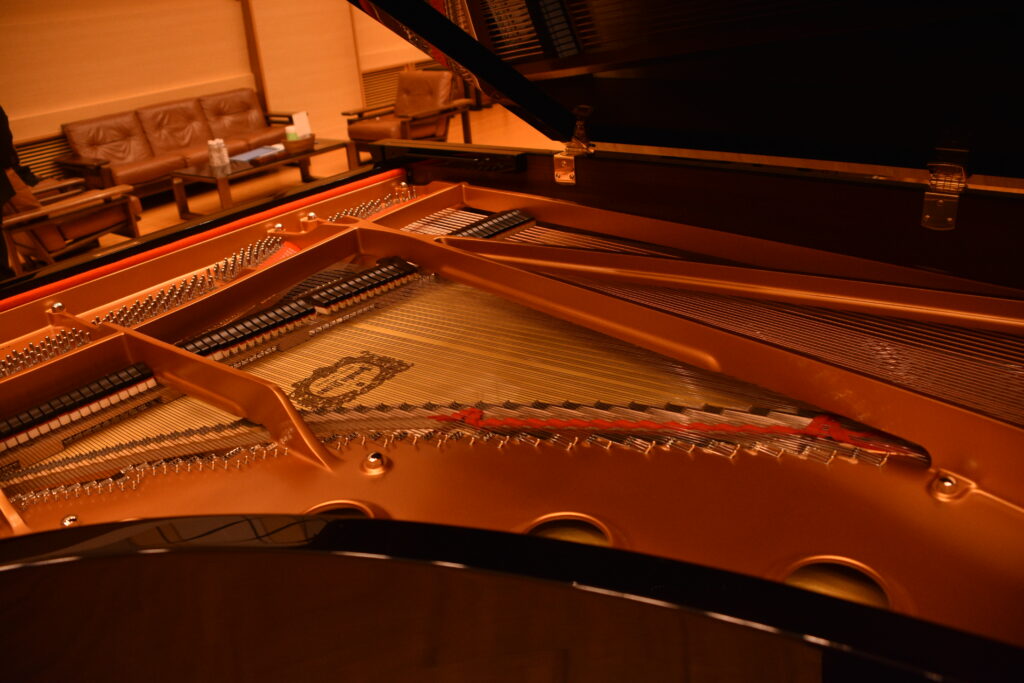 選定はこちらの施設内のホールで行います。普段は選定室で行われますが、今回はコンサートホール用のピアノの音の響きなどを測定・確認するため、関係者しか入れないこちらのホールで特別に実施。音がしっかりと響く設計で立派なホールです。