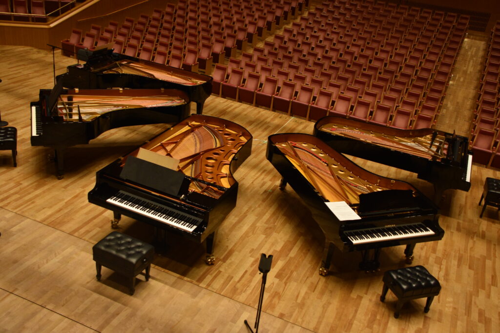 左奥からスタインウェイ D274・フルコンサート、ヤマハ CF-Ⅲ・フルコンサート、ベーゼンドルファー インペリアル290、ヤマハ CF-ⅢS・フルコンサート、スタインウェイ D274・フルコンサート