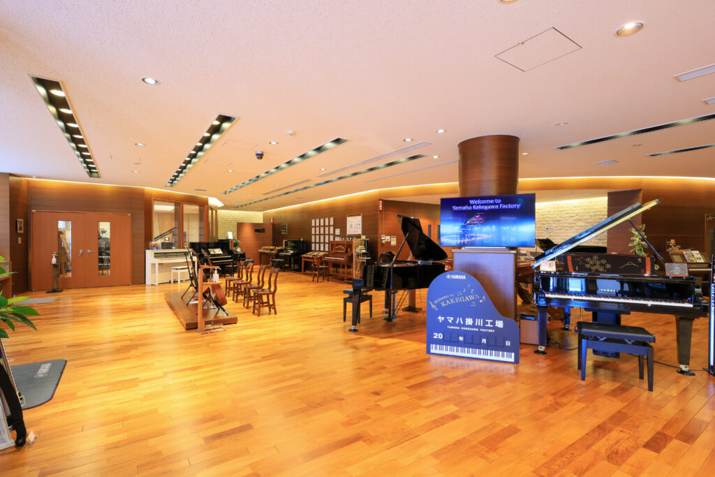 ピアノ工場見学にお越しになる方々をお迎えする「ヤマハ掛川工場」の玄関となる施設です。工場見学の受付だけでなく、併設するショールームに貴重な楽器の展示やお試しいただける楽器も用意されています。