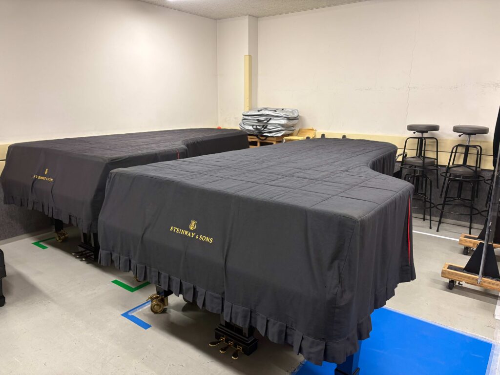 ピアノ庫は、コンサートホールの舞台袖のすぐ近くと、別のフロアの2か所に分かれています。