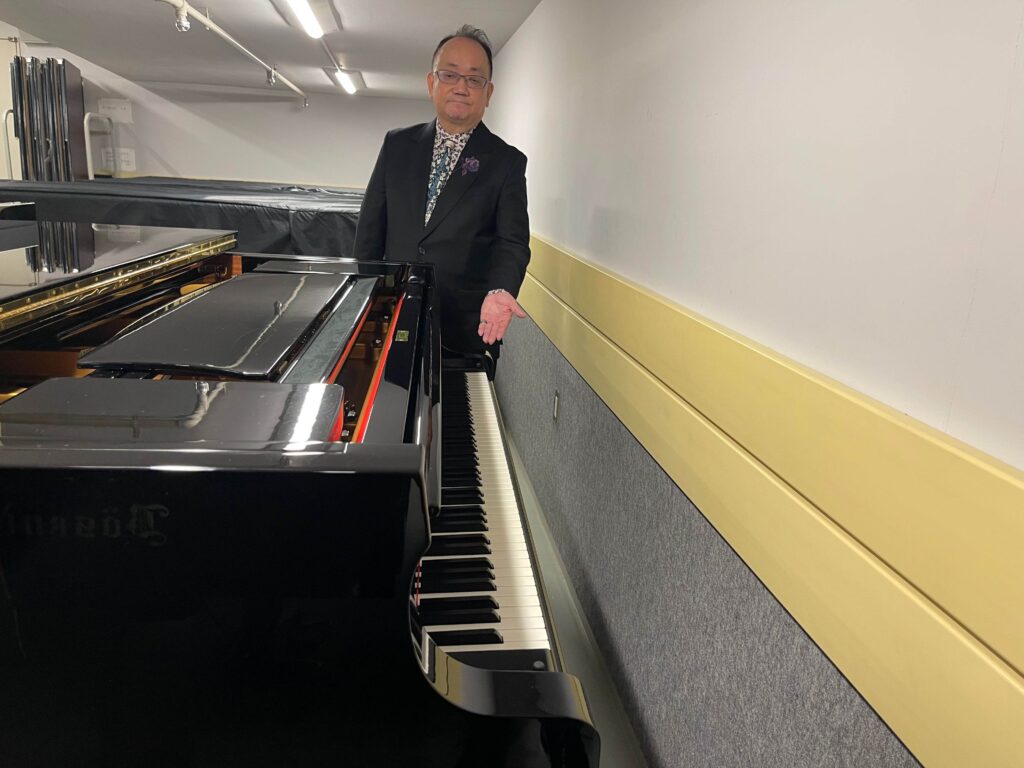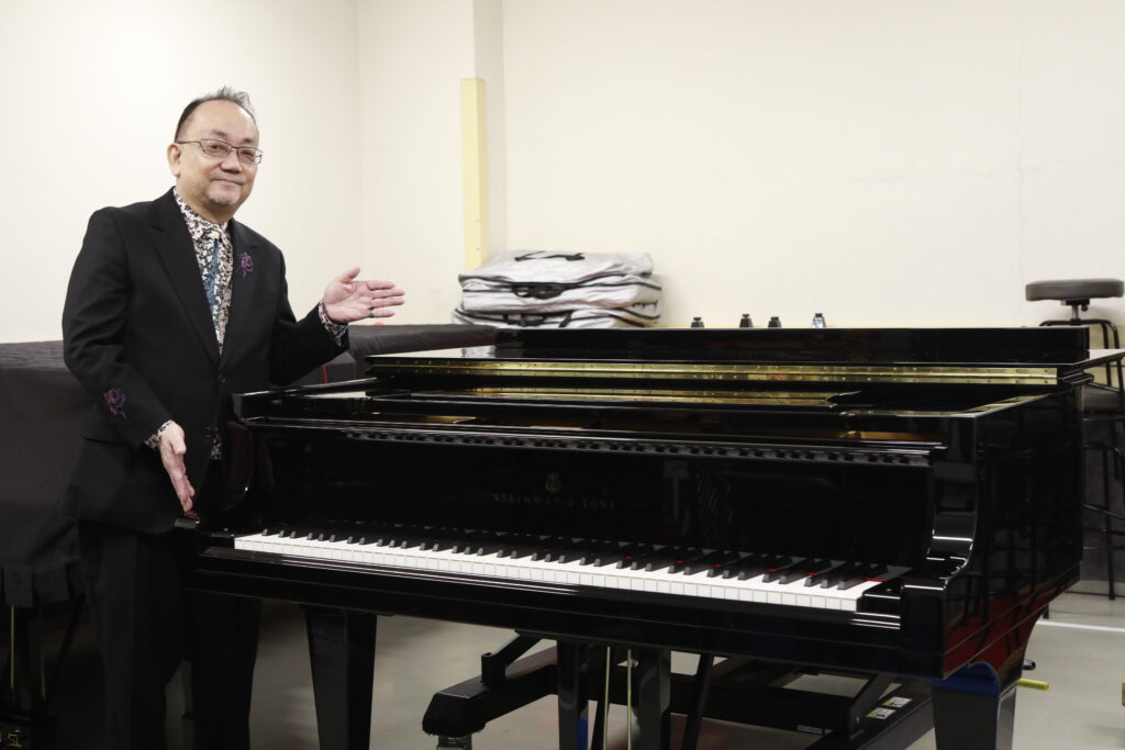 愛知県芸術劇場 浅野芳夫支配人とスタインウェイ「D274」。