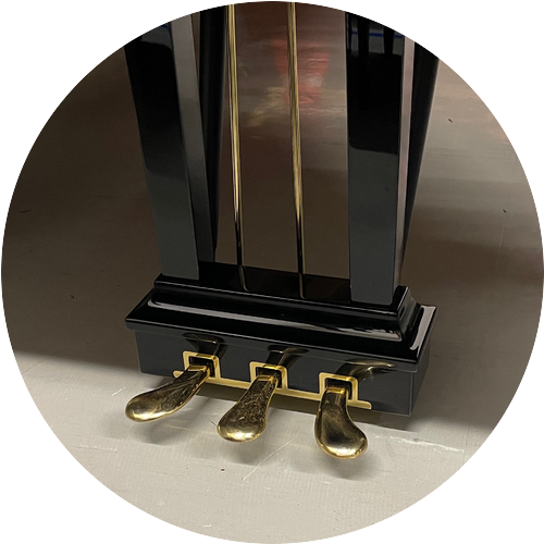 外装が黒色艶出し、ペダルや蝶番は真鍮製、内部の鋳鉄フレームはゴールド塗装で、とても美しいです。愛知県内の芸術大学の学生などにも使われていて、たくさんの演奏家に憧れのピアノを弾く喜びを感じてもらっています。劇場は夢を与える場所ですから。それがやがて幸せのブーメランのように、私たちのところに返ってくることもあるんです。